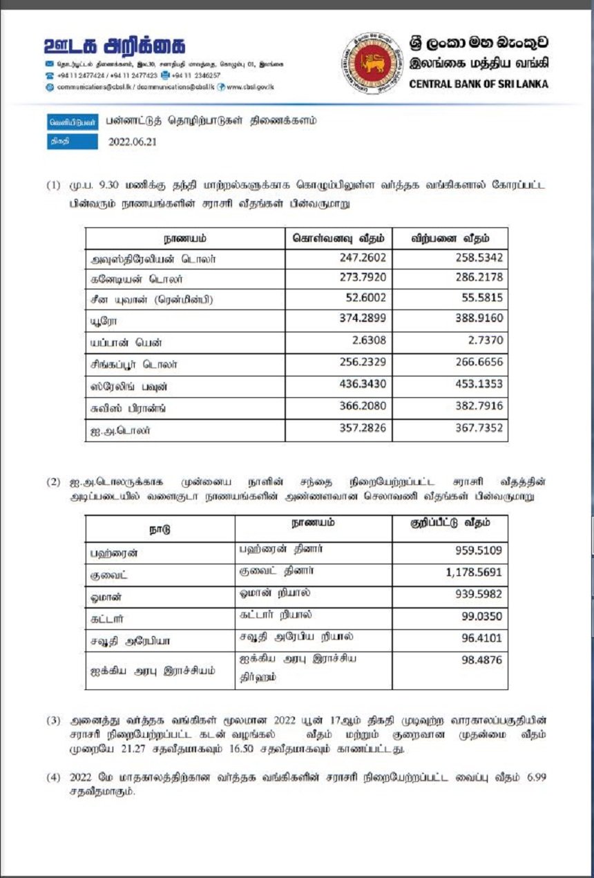 இலங்கை மத்திய வங்கியினால் வெளியிடப்பட்ட(21.06.2022) நாணய மாற்று விகிதங்கள் வருமாறு: