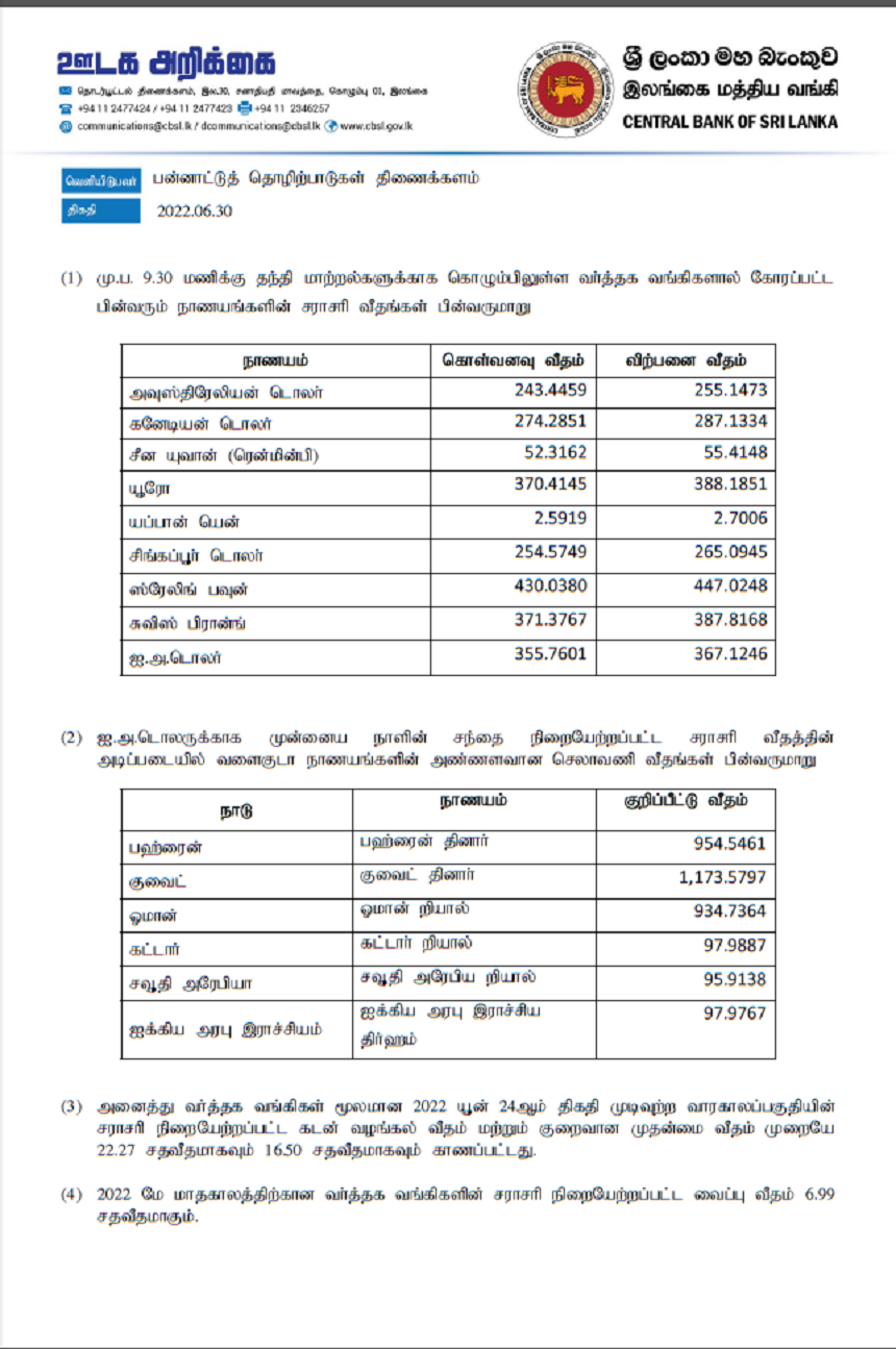 இலங்கை மத்திய வங்கியினால் வெளியிடப்பட்ட(30.06.2022) நாணய மாற்று விகிதங்கள் வருமாறு: