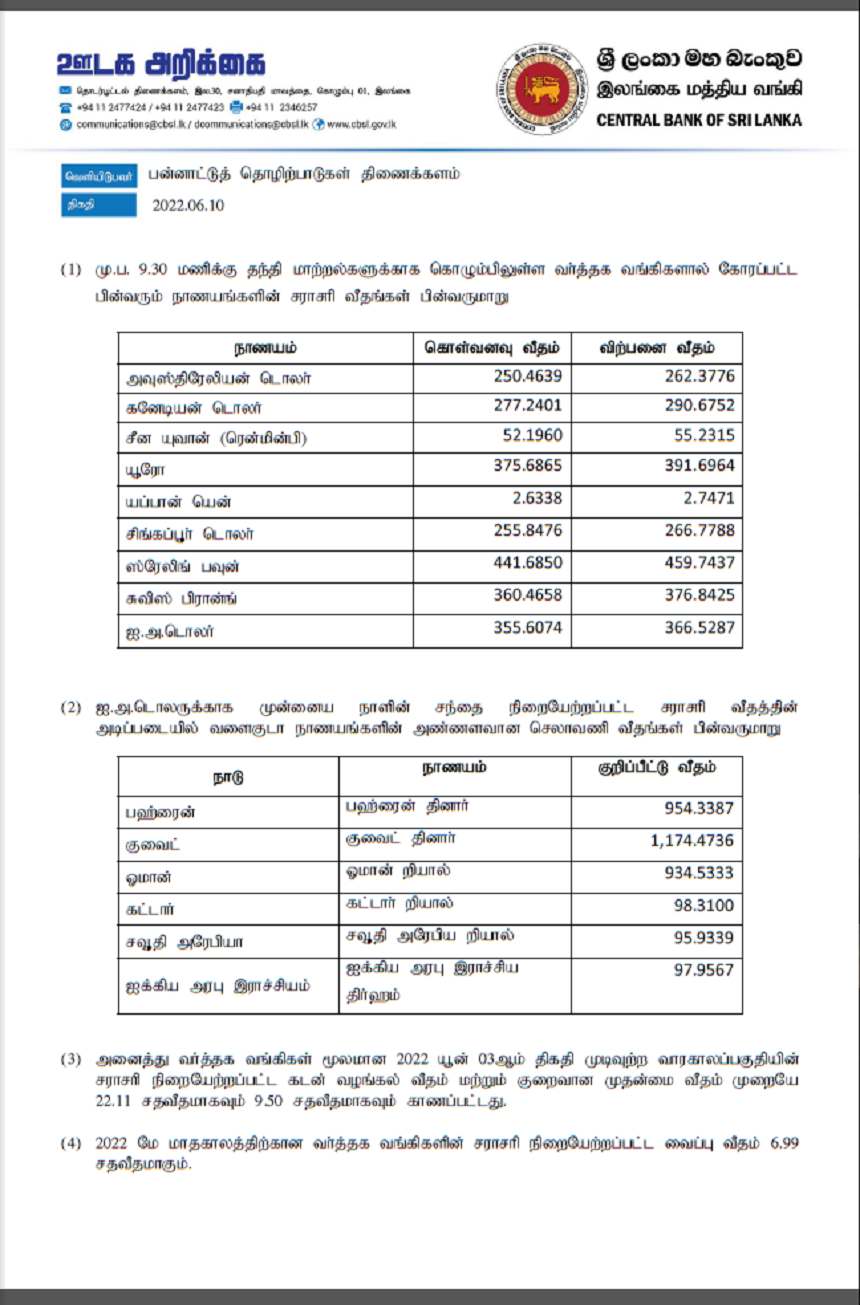 இலங்கை மத்திய வங்கியினால் வெளியிடப்பட்டுள்ள இன்றைய (10.06.2022) நாணய மாற்று விகிதங்கள் வருமாறு:
