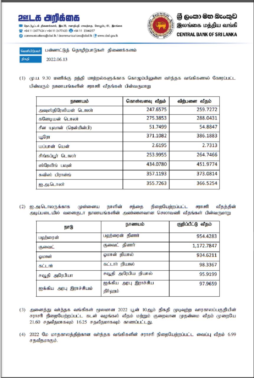 இலங்கை மத்திய வங்கியினால் வெளியிடப்பட்டுள்ள இன்றைய (13.06.2022) நாணய மாற்று விகிதங்கள் வருமாறு: