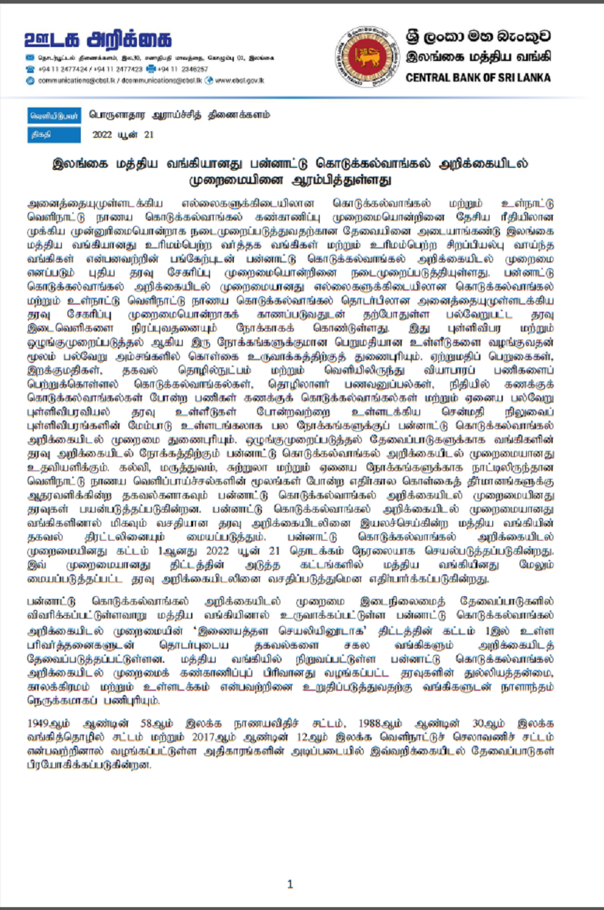 இலங்கை மத்திய வங்கி பன்னாட்டு கொடுக்கல் வாங்கல் அறிக்கையிடல் முறைமையினை ஆரம்பித்துள்ளது