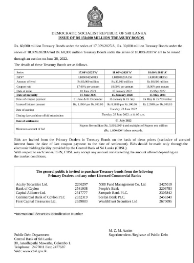 150 பில்லியன் ரூபா பெறுமதியான பாரிய பிணைமுறி வெளியீட்டுக்கு இன்று விண்ணப்பங்கள் கோரப்பட்டுள்ளன.