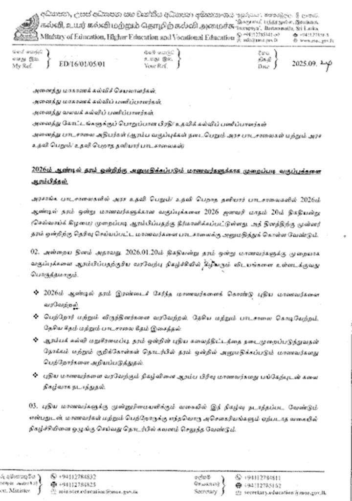 2026 ஆம் ஆண்டில் தரம் ஒன்றிற்கு அனுமதிக்கப்படும் மாணவர்களுக்கான முறைப்படி வகுப்புக்களை ஆரம்பித்தல் தொடர்பாக கல்வி அமைச்சு சுற்றிக்கை ஒன்றினை வெளியிட்டுள்ளது.