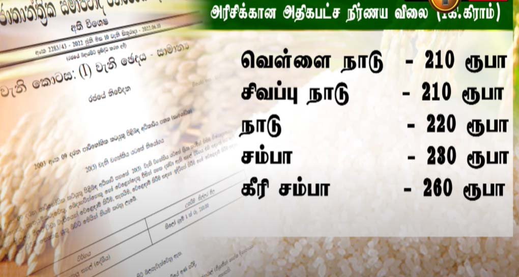 ஒரு கிலோகிராம் வெள்ளை மற்றும் சிவப்பு பச்சை அரிசியின் அதிகபட்ச சில்லறை விலை 210 ரூபா என அறிவித்து அதிவிசேட வர்த்தமானி அறிவித்தல் வெளியிடப்பட்டுள்ளது. நேற்று (10) முதல் நடைமுறைப்படுத்தப்படும் வகையில், அதிகபட்ச சில்லறை விலை, நுகர்வோர் விவகார அதிகார சபையினால் நிர்ணயிக்கப்பட்டுள்ளது. இதேவேளை, ஒரு கிலோகிராம் நாட்டரிசியின் அதிகபட்ச சில்லறை விலை 220 ரூபாவாகும். சம்பா அரிசியின் அதிகபட்ச சில்லறை விலை 230 ரூபாவாகும். ஒரு கிலோகிராம் கீரிசம்பா 260 ரூபாவாகும். இதற்கமைய, குறிப்பிடப்பட்டுள்ள அதிகபட்ச […]